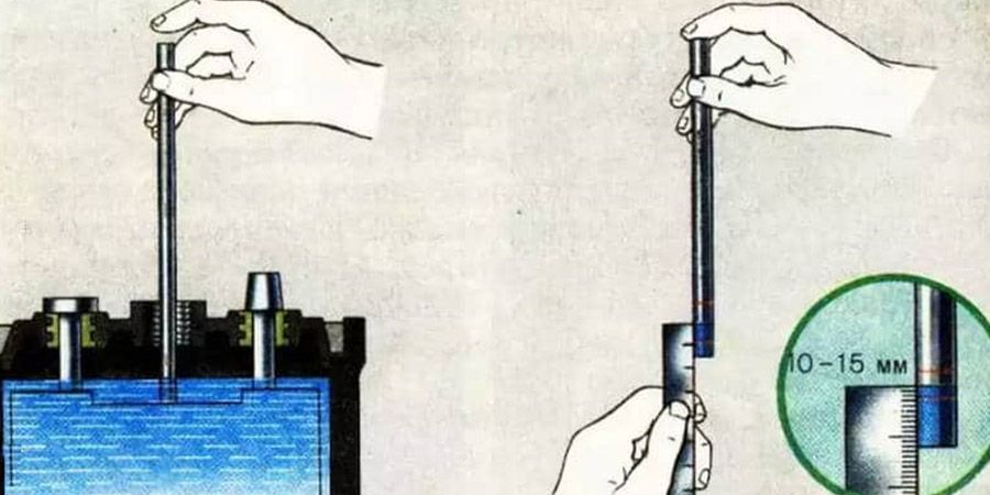 - Путём выполнения несложных замеров. Уровень электролита в аккумуляторе можно проверить, используя: