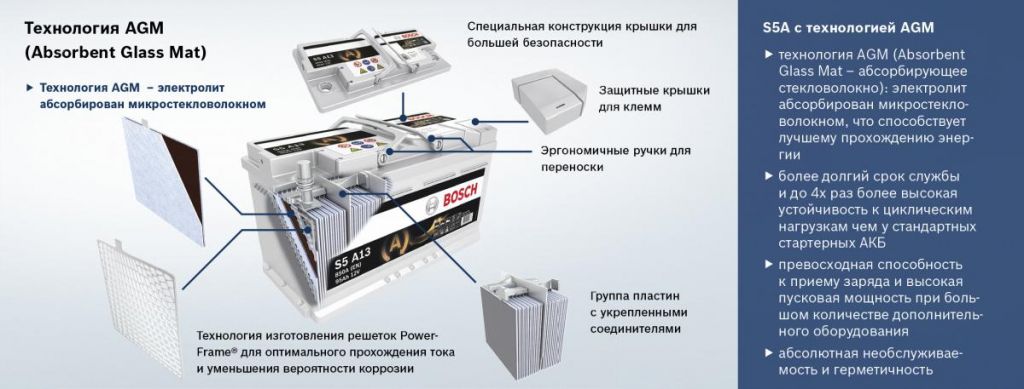Самая главная особенность AGM-технологий это отсутствие электролита. А точнее, он присутствует, но только в пропитанном виде в стекловолокне, которое располагается между катодом и анодом. В остальном технологии похожие, есть небольшие различия в конструкции. Также немного отличаются правила зарядки.