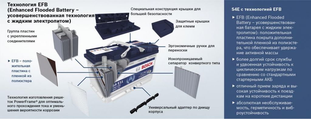 EFB — улучшенная технология с жидким электролитом. На + пластине добавлен полиэстеровый материал который помогает закрепить активную массу на пластине, что в разы повышает срок службы батареи.