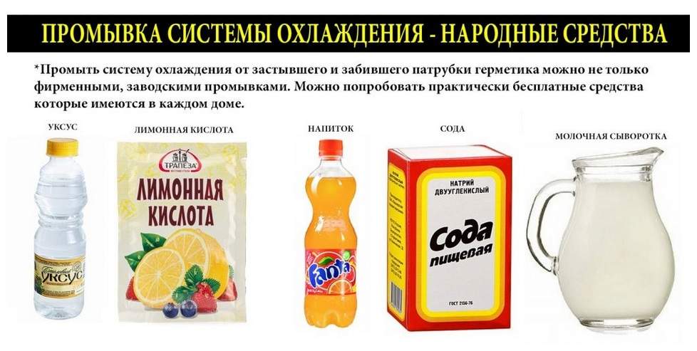 Что касается других средств, народных. Использовать их не рекомендуется в принципе, так как эффективности мало, а неумелые действия способны нанести вред радиатору и двигателю. Однако приведём ниже эти вещества, которые незначительно помогают промыть контур охлаждения и лучше проявляют себя во время профилактических мероприятий.