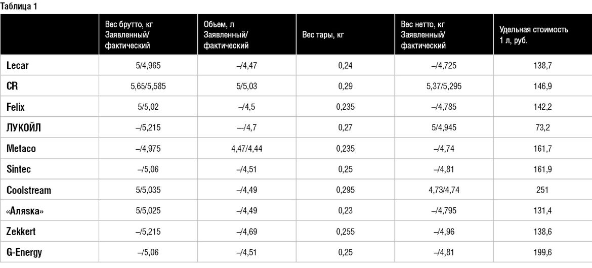 Для начала попробуем разобраться с весом и объемом, что необходимо для вычисления удельной стоимости 1 литра охлаждающей жидкости. Увы, добрая половина производителей просто пишет: «Вес 5 кг», ну а покупатель сам должен догадаться, указана масса нетто или брутто. Для таких производителей мы ставим прочерк в таблице веса.