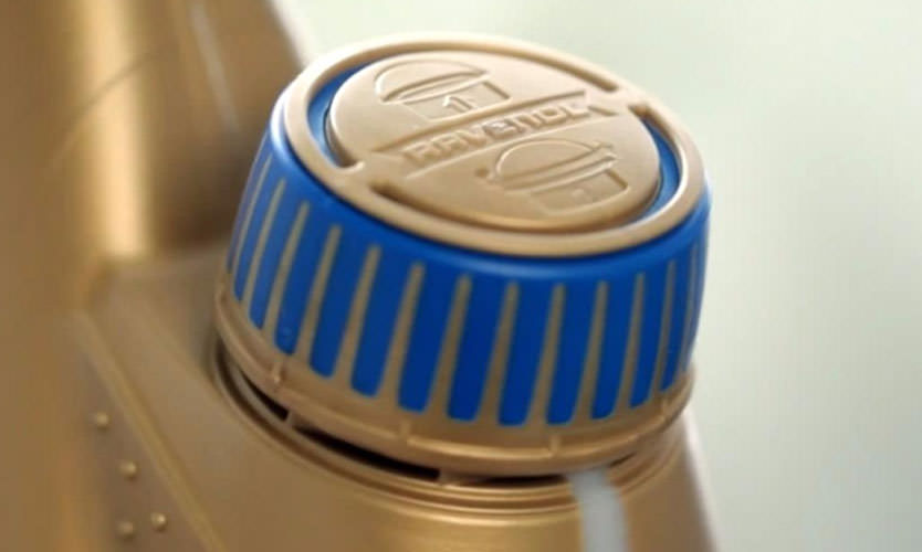 В первую очередь обращаем внимание на крышку, она выполнена по уникальной запатентованной компанией технологии вплавления пластмассы разного цвета и фактуры. Золотистая часть крышки по фактуре совпадает с канистрой, синяя шершавая