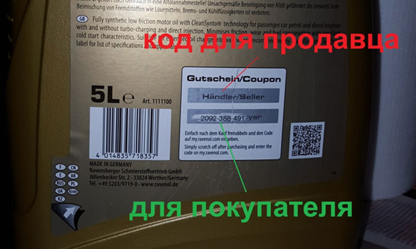 Каждая канистра надежно защищена от подделки проверочными кодами, один указывается для продавца, второй для покупателя. Проверить код можно на официальном сайте my.ravenol.com/.
