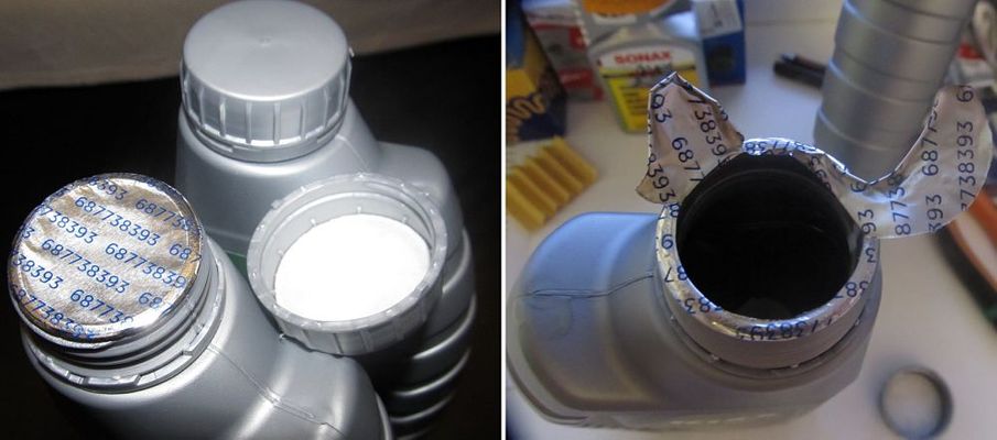 Оригинальный смазочный материал разливается в пластиковую тару (или металлическую), которая может иметь вкрапления и переливаться на свету. Кроме того, отметим наличие ровных швов и гладкую поверхность канистры, отсутствие заусенцев, раковин и прочих дефектов литья. Подделки имеют неоднородный пластик, который еще и просвечивается таким образом, что можно разглядеть места спайки двух половинок канистры. Не исключено наличие неприятного запаха. Еще кустарная канистра отличается неровной разметкой шкалы уровня масла, либо цветными метками вместо литья.