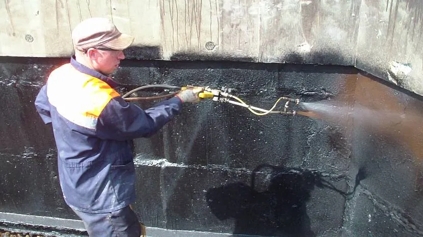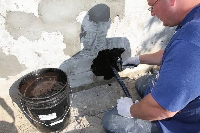- Обработка фундамента жидкой резиной начинается с нижней точки, постепенно поднимаясь к цоколю строения.