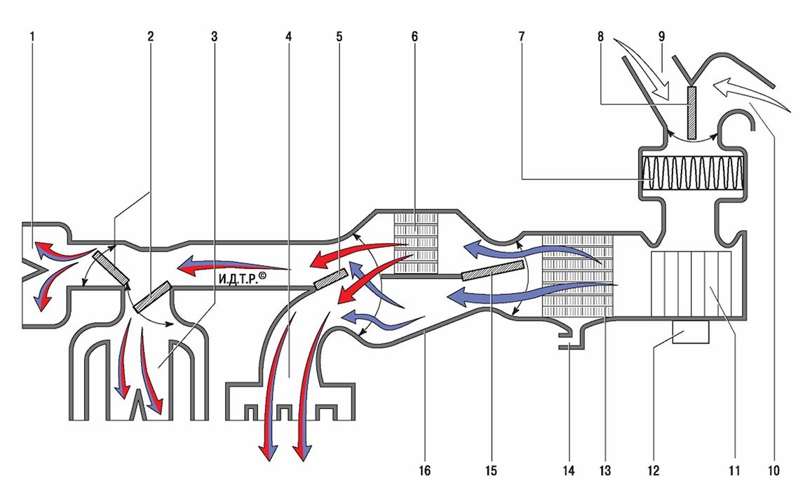 От изменения ее положения зависит количество воздуха, проходящего через теплообменник отопителя, и наружного воздуха, проходящего в обход теплообменника;
