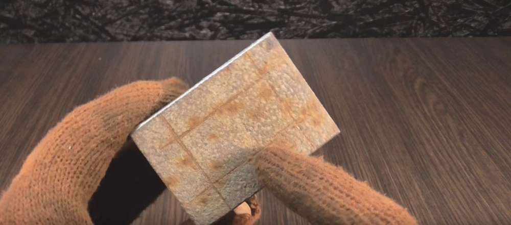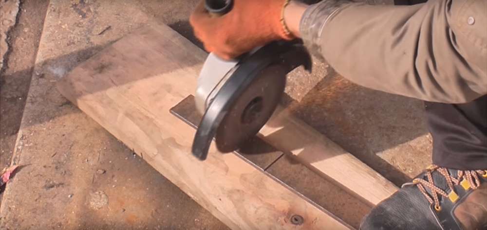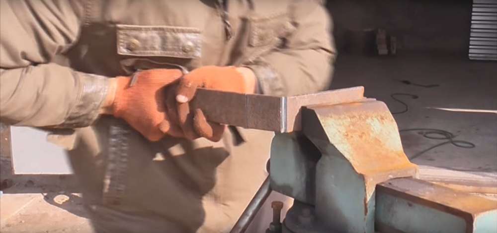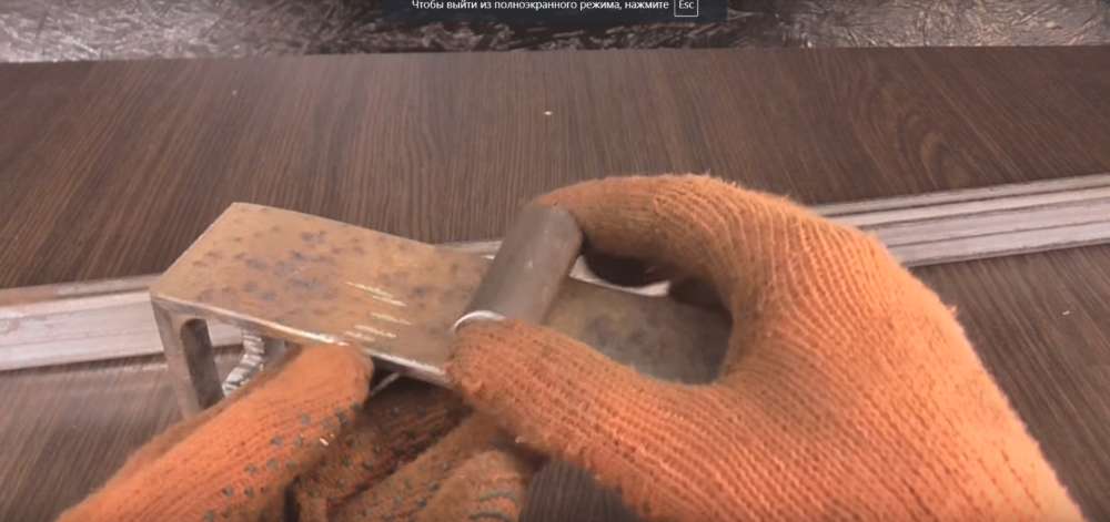Далее необходимо изогнуть металлическую пластину, длиной около 400 мм, и получить П-образную форму детали. Чтобы проще и точнее это сделать, можно в местах изгиба сделать надрезы болгаркой, а затем проварить раскрытые швы. Края пластины скругляем и зачищаем.