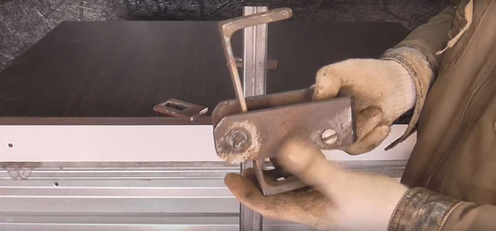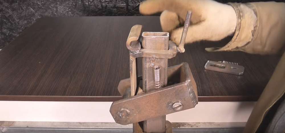 В отрезке швеллера вырезаем отверстие, ввариваем гайку, вкручиваем винт.
