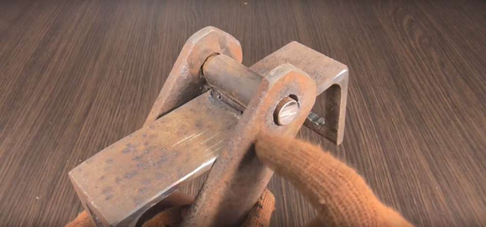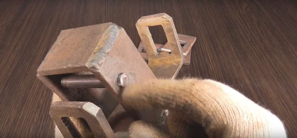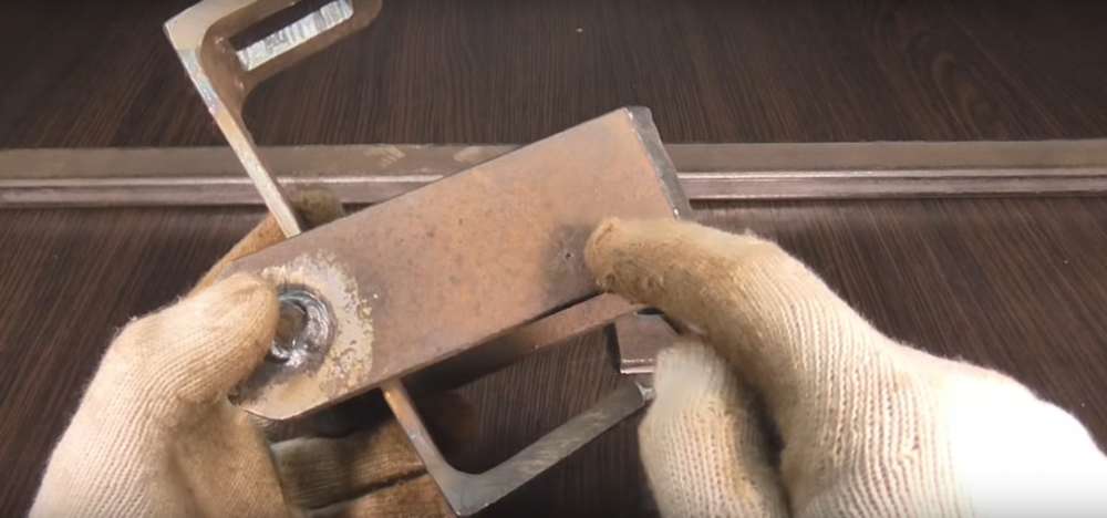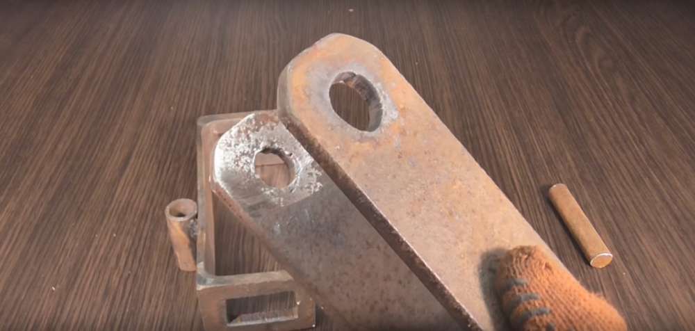 Примеряем посадку детали, вставляем палец (ось) и обвариваем его. Зачистить место сварки удобнее всего болгаркой со шлифдиском. Основа нашего домкрата готова.