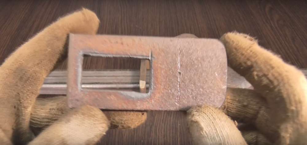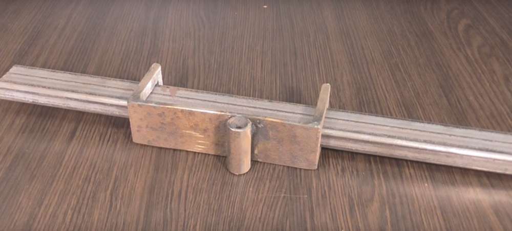 Кусок пол-дюймовой трубы приваривается с тыльной стороны швеллера с легким смещением от середины.
