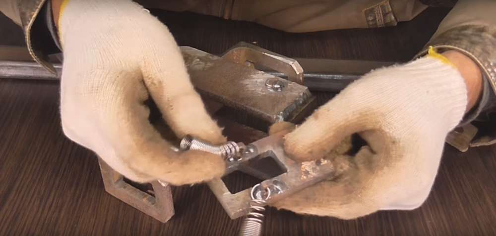 Остается приспособить для неё возвратный механизм, чтобы она сама возвращалась в исходное положение после давления рычага. Для этого привариваем четыре гайки на 6 мм к пластине и рамке домкрата. За них цепляем пружины, и проверяем их работу.