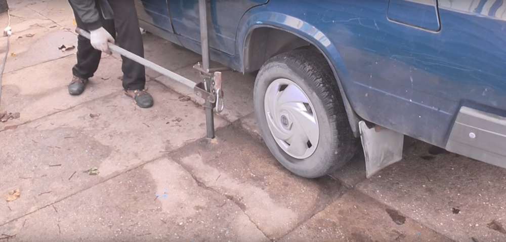 Принцип работы самодельного приспособления очень прост. Упираем подкат в днище автомобиля. Потом собственным весом давим на рычаг, и приподнимаем автомобиль. При этом на рычаг давить уже не нужно.