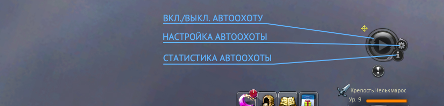 По умолчанию иконка автоохоты находится над мини-картой в правом нижнем углу.Начать автоохоту можно сочетанием клавиш Shift+A (его можно изменить в настройках горячих клавиш).Основными кнопками управления автоохотой являются настройка, статистика и вкл./выкл.
