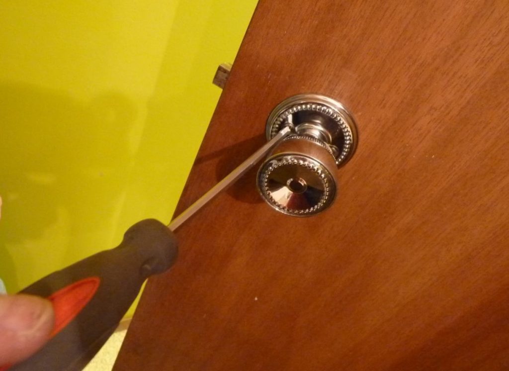 Для того, чтобы разбирать круглую ручку в дополнению к отвертке потребуется специальный ключ, который позволит отжать установленный в изделии пружинный механизм. Обычно такой ключ прилагается в комплекте с ручкой — кноб, но он может и не подойти по длине. Если это произошло в вашей ситуации, не нужно паниковать. Достаточно взять гвоздь или другой тонкий предмет и вскрыть им механизм.