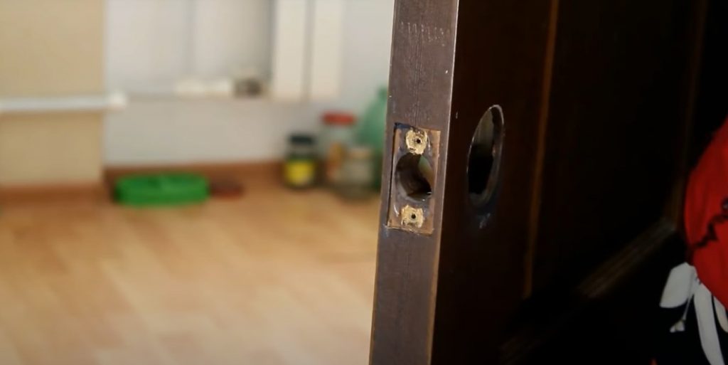 - Когда ригель больше ничего не удерживает, используя стамеску или отвёртку в качестве рычага, механизм можно свободно извлечь из посадочного отверстия.