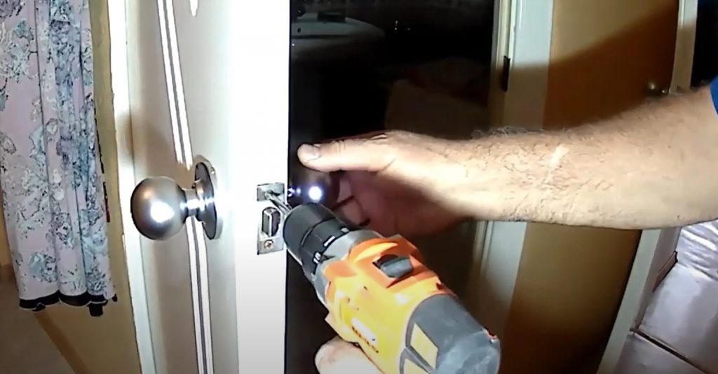 Откручивается накладка на замке со стороны торца дверного полотна.