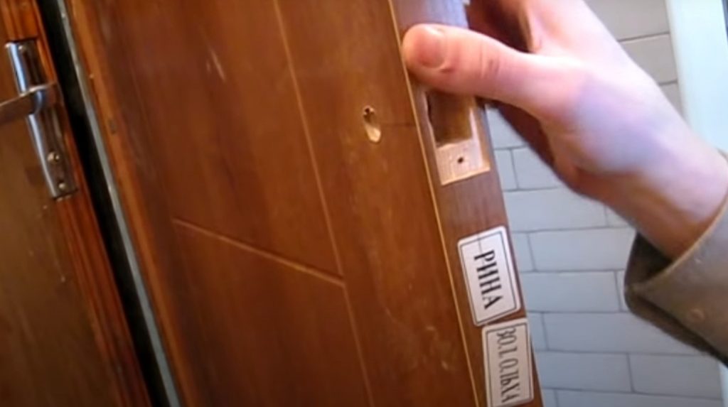 - Стационарная ручка. При демонтаже детали, которая никак не связана с запирающим механизмом, достаточно одной отвёртки, чтобы открутить все саморезы, удерживающие её в полотне двери.