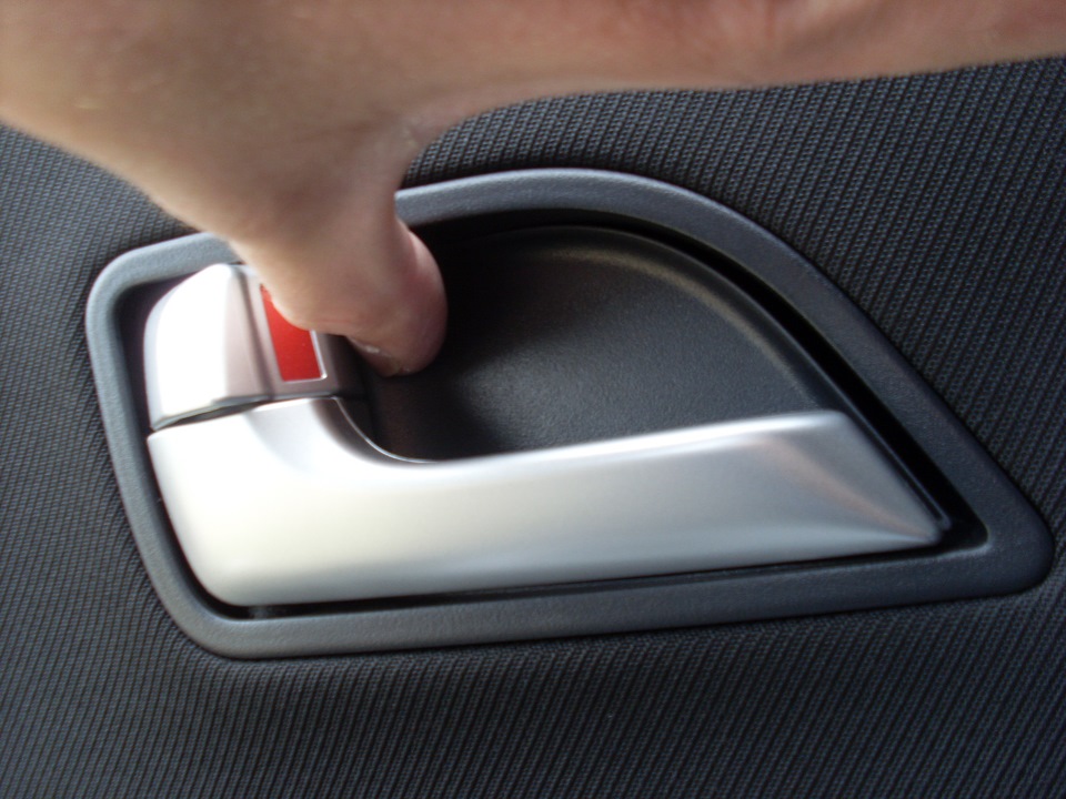 - Вставить деревянный клин под ручку стеклоподъемника, в образовавшуюся щель просунуть стальной крючок, нащупать стальную скобу и выдернуть ее с фиксатора. Скоба находится чуть выше над ручкой.