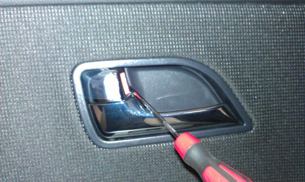 - Выкрутить два самореза, расположенных под панелями. Чтобы быстро вытащить накладку с ручки, надавите на ее верхний угол слева, в щель продвиньте крючок или плоскую отвертку и приподнимите деталь, преодолевая сопротивление внутреннего фиксатора.
