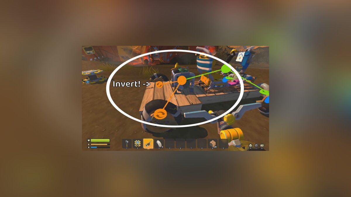 Далее нужно связать узлы автомобиля при помощи инструмента. Можно поднять машину на лифте, чтобы было удобнее работать с ней. Соедините сидение водителя с колесами, чтобы можно было рулить. Правой кнопкой меняйте направление рулежки (кликайте на зеленые иконки)