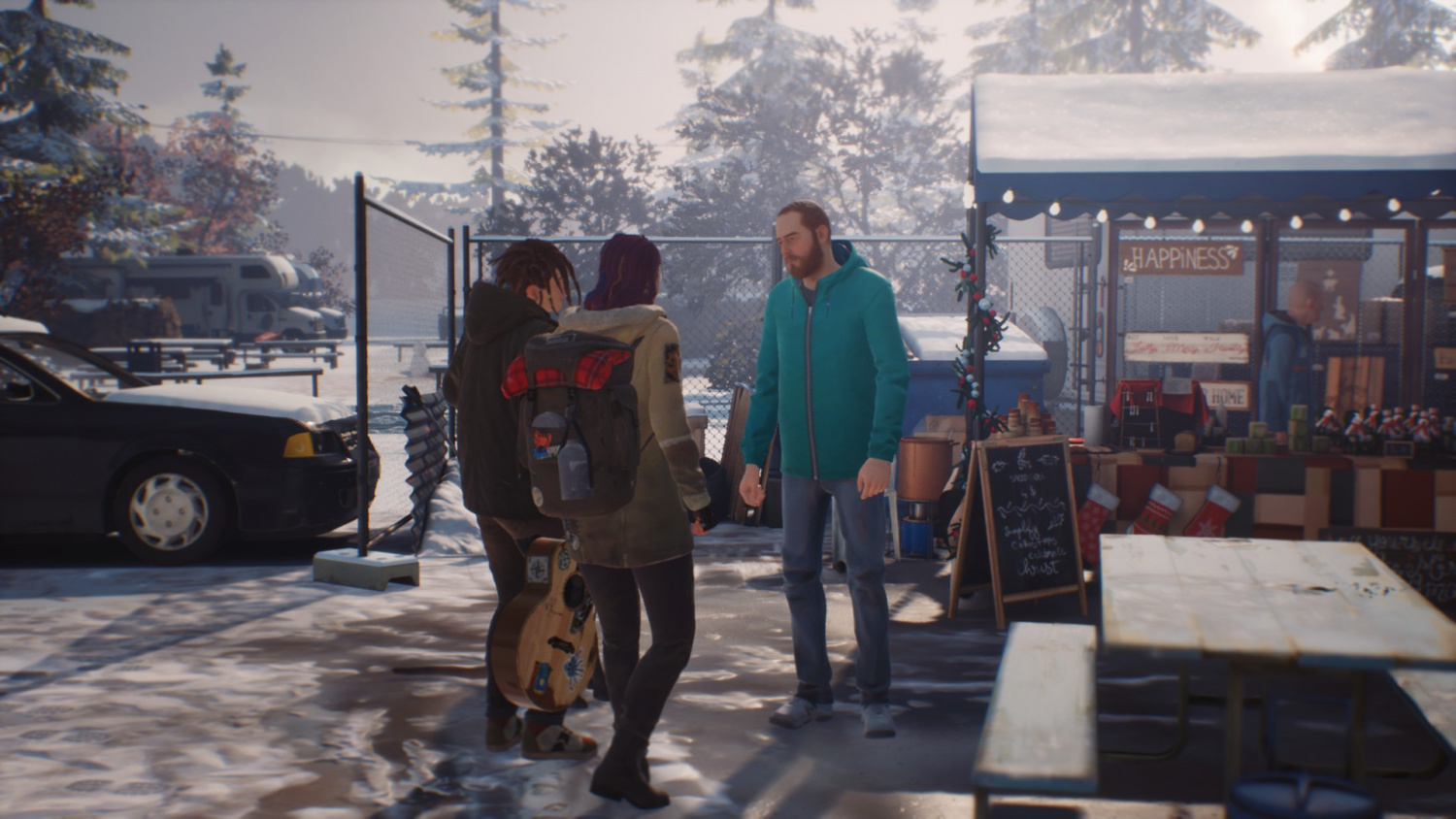 После разговора идем на рождественскую ярмарку. Мы должны прикупить подарок брату. Здесь же найдется и пятый сувенир (но сначала возьмем подарок). Пока Даниэль вместе с Крисом и Чарльзом выбирают елку на рождество, мы можем пройти дальше к палаткам.
