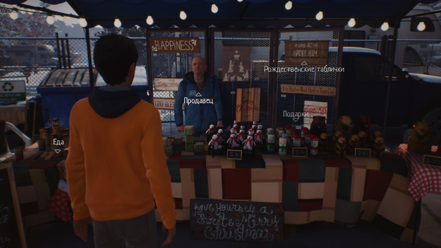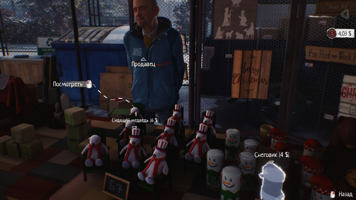 Далее подходим к продавцу рождественских сувениров и заводим разговор.