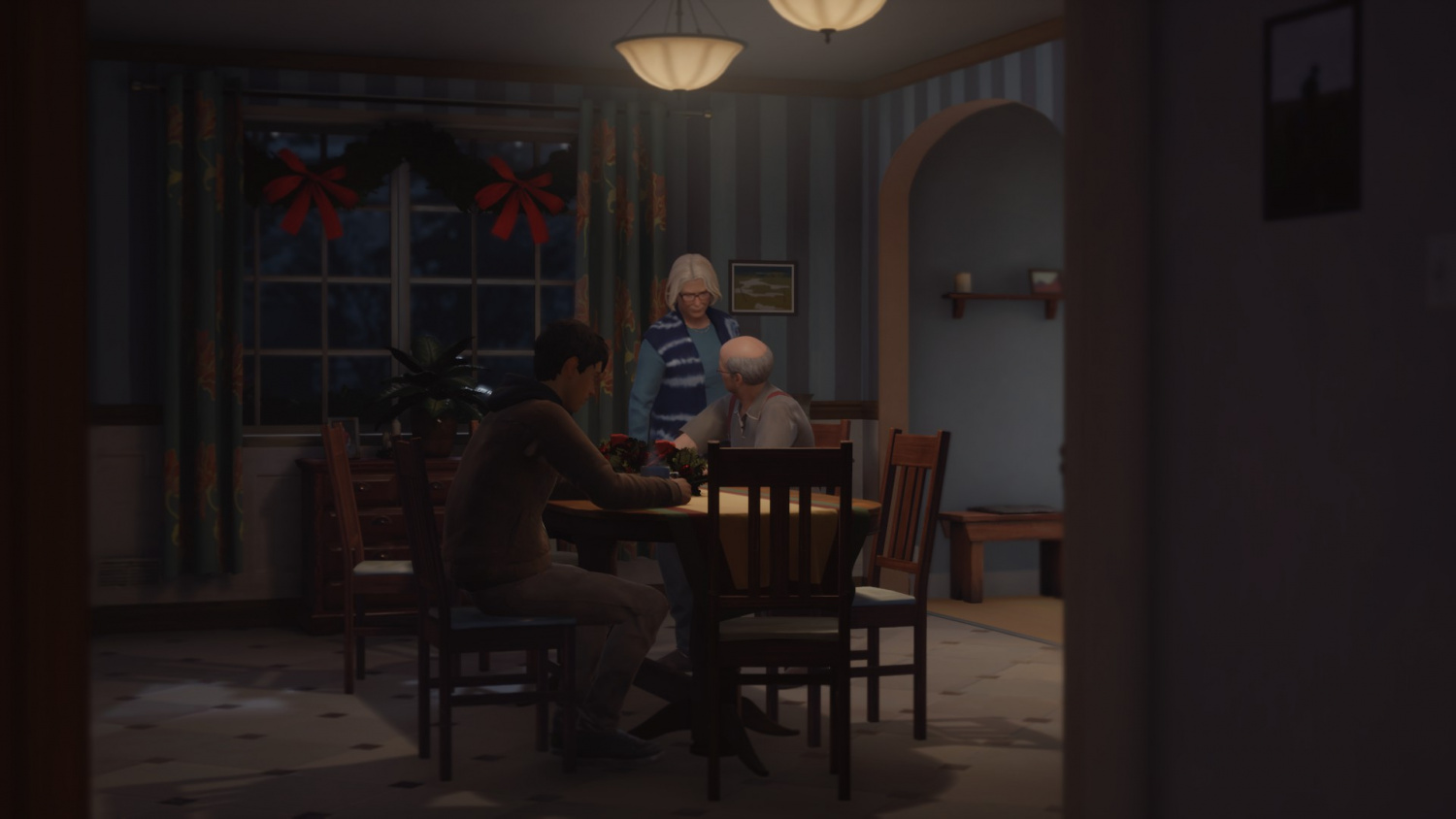 Сразу после этого раздастся стук в дверь – это местная полиция. Пока бабушка будет их отвлекать, мы сбегаем через задний двор, там нас встретит Крис.
