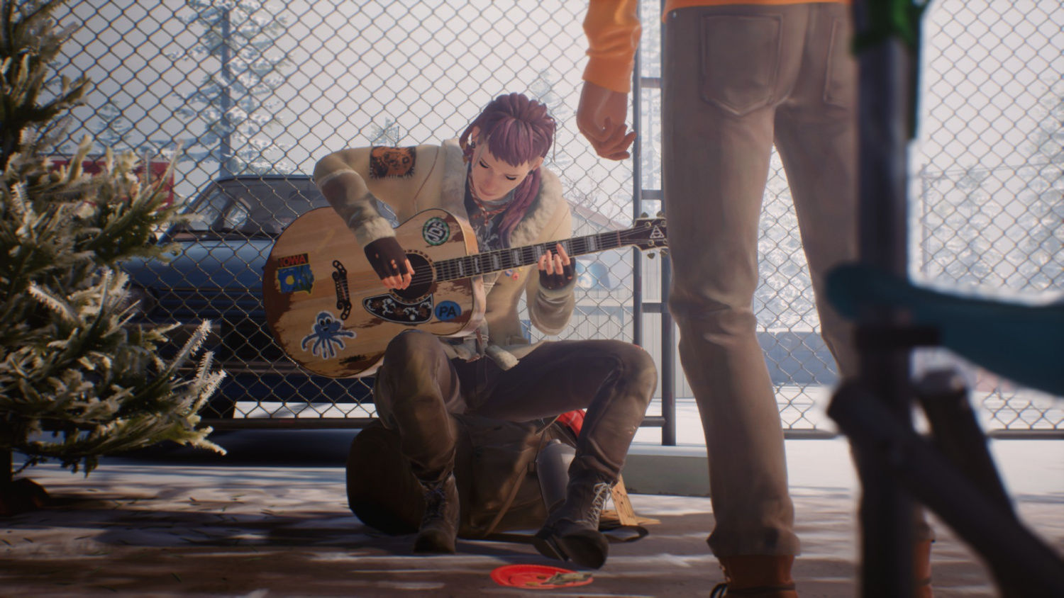 Здесь же, возле палаток, будет сидеть девушка с гитарой. Можем подкинуть ей немного денег. Чтобы получить пятый коллекционный предмет, мы должны послушать ее песню.