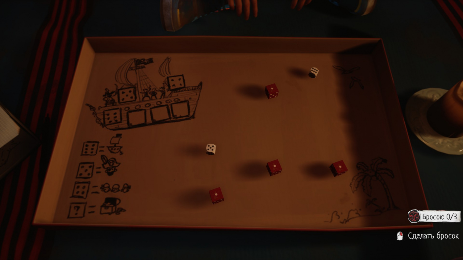 Правила игры довольно просты: необходимо, чтобы выпало 3 значения – 4 (команда), 5 (капитан) и 6 (корабль). Когда соберете три числа, можно сделать последний бросок и собрать выпавшую добычу. Кто набрал больше очков, тот и победил.