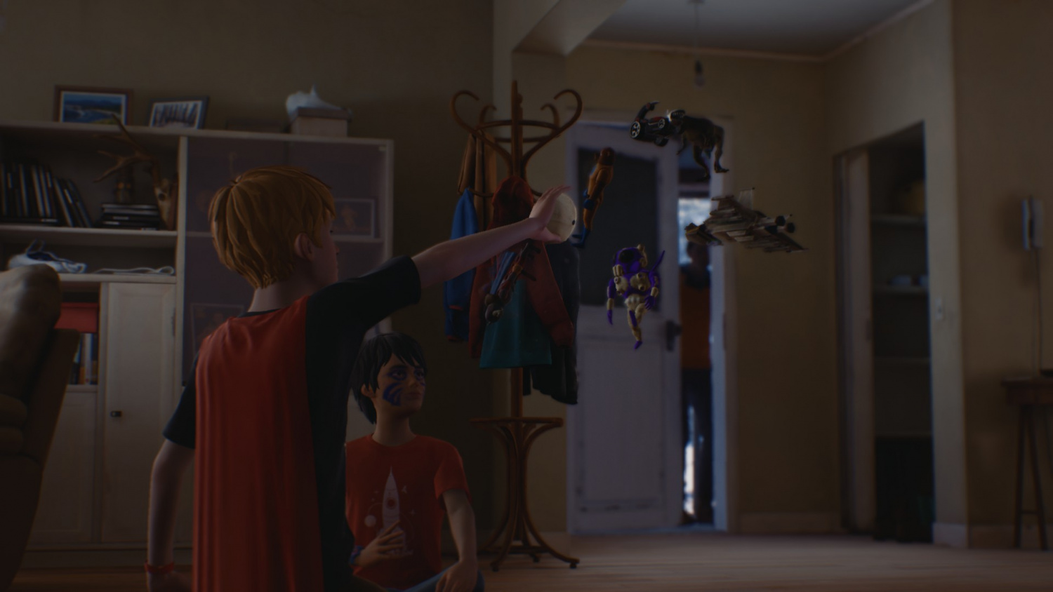 После проходим в дом и видим, как Даниэль играется своей способностью перед Крисом. Как оказалось, соседский мальчик уверен в том, что это его силы и теперь он супергерой – «Капитан Спирит».