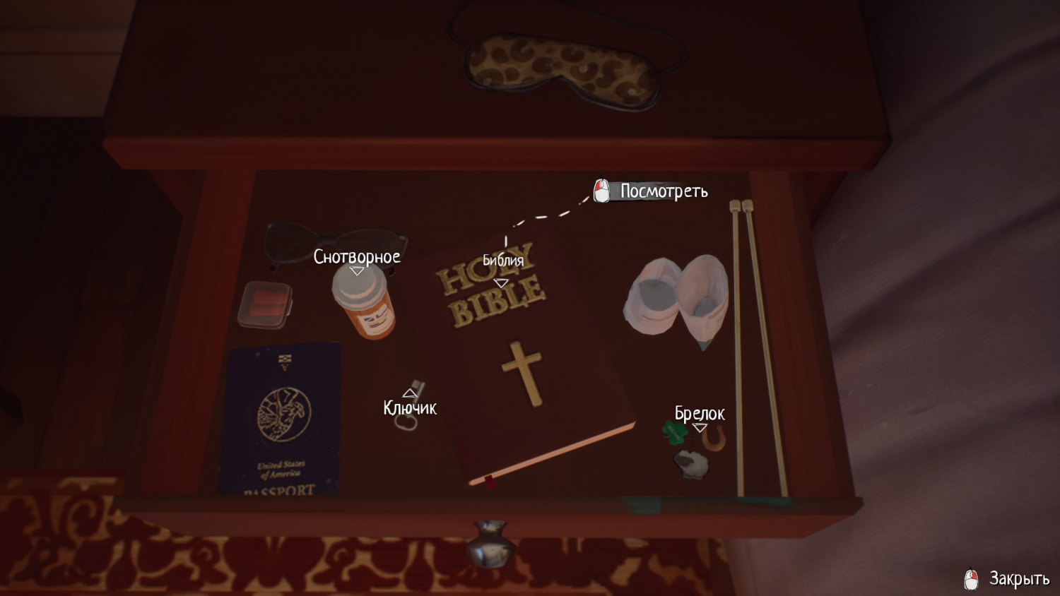 В прикроватной тумбе слева от кровати (судя по всему, с этой стороны спит Клэр) обнаружим библию, снотворное, брелки и ключик от выдвижного ящика.