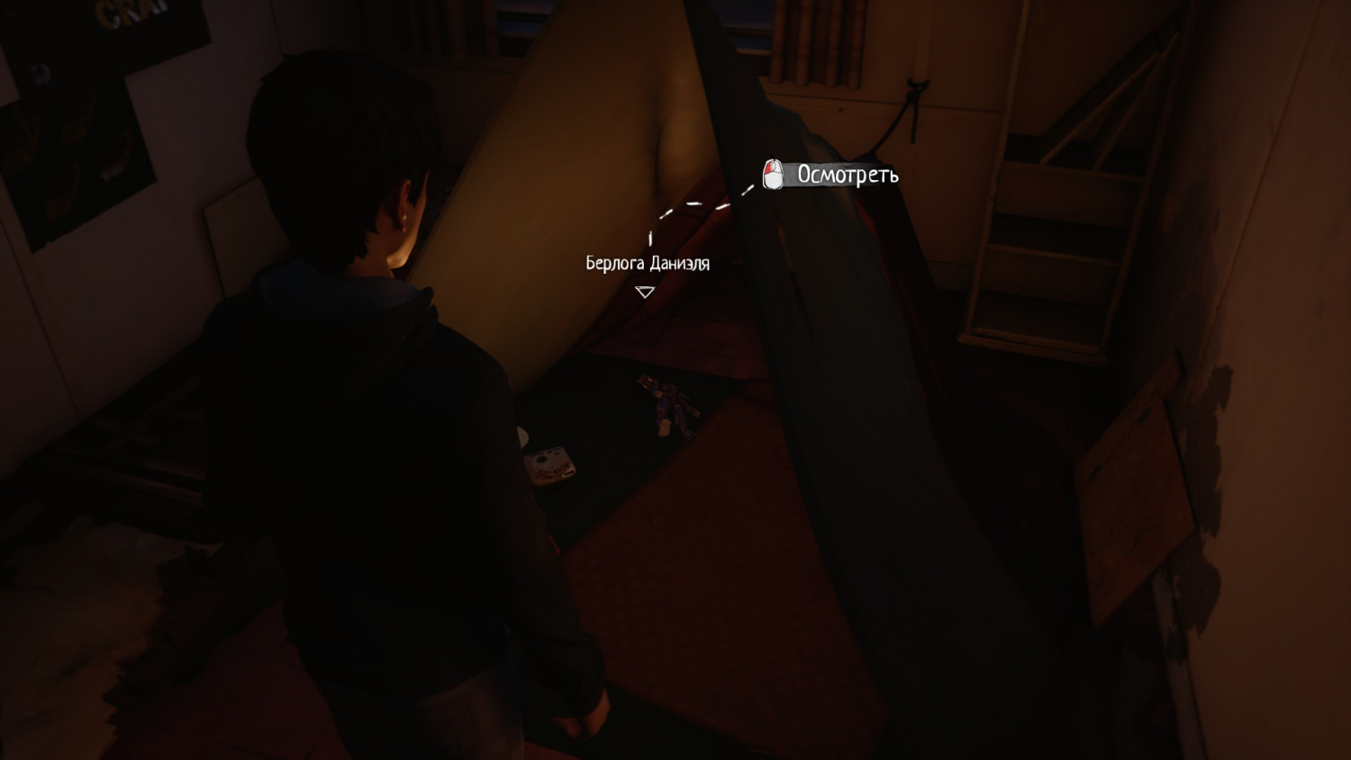 У стены возле печки найдем доску с достижениями Даниэля. На холодильнике висит фотография прошлых хозяев этого заброшенного дома. Возле кровати обнаружим рюкзак младшего брата, в котором будут лежать одни шишки.