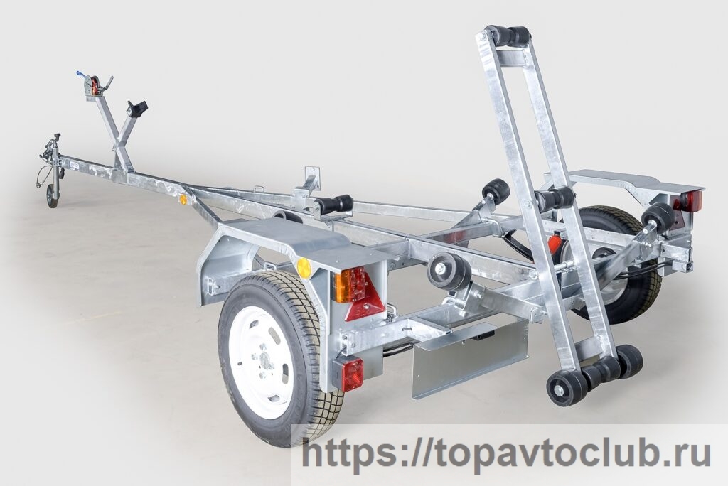 Прицеп Трейлер 82944С (5 метров / РЕС) — предназначен для перевозки лодок или катеров. Рессорная подвеска. Килевые ролики служат основной опорой для лодки/катера. Подножки облегчают погрузку/разгрузку водной техники. Ложементы, служат дополнительной опорой для лодки/катера.