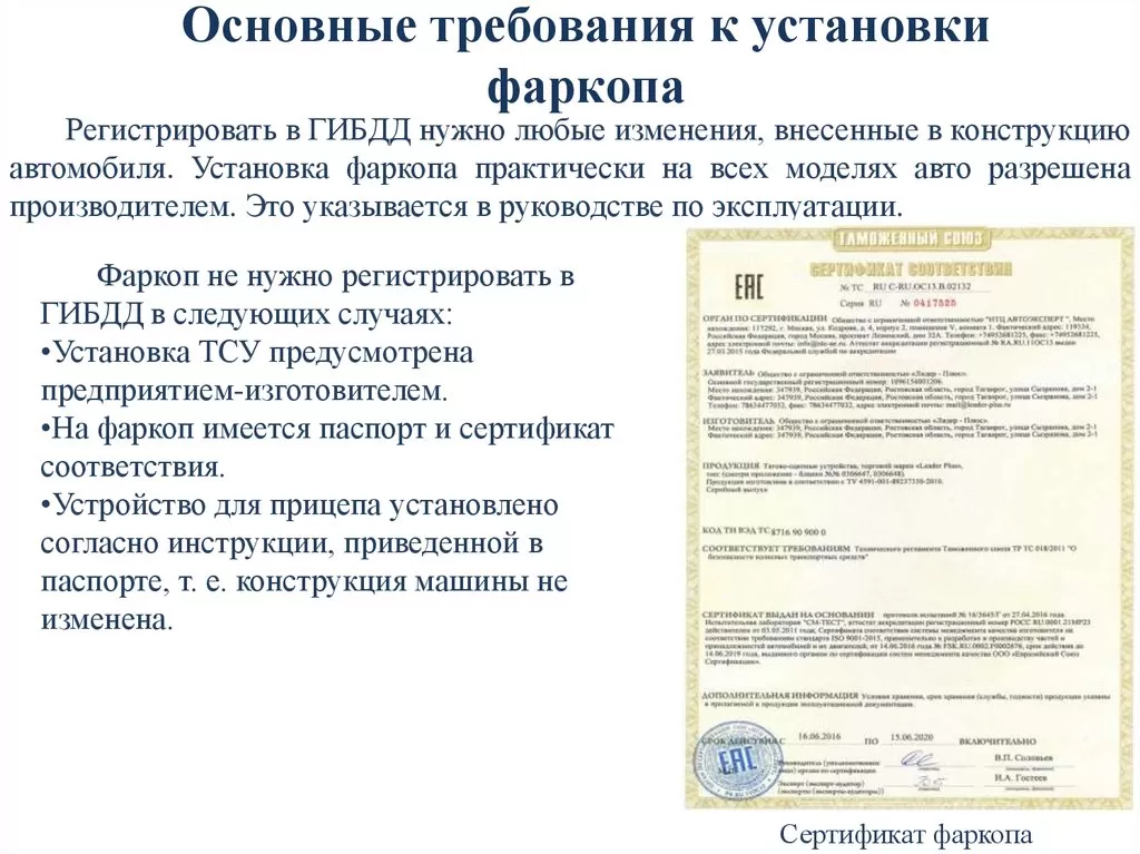 Если завод-изготовитель предусмотрел места для крепления ТСУ, а также внес это оборудование в список дополнительных приспособлений для машины, тогда его монтаж не является изменением конструкции транспортного средства, и не требует регистрации. Однако инспектору при проверке, понадобится предъявлять паспорт на фаркоп, и его сертификат соответствия.