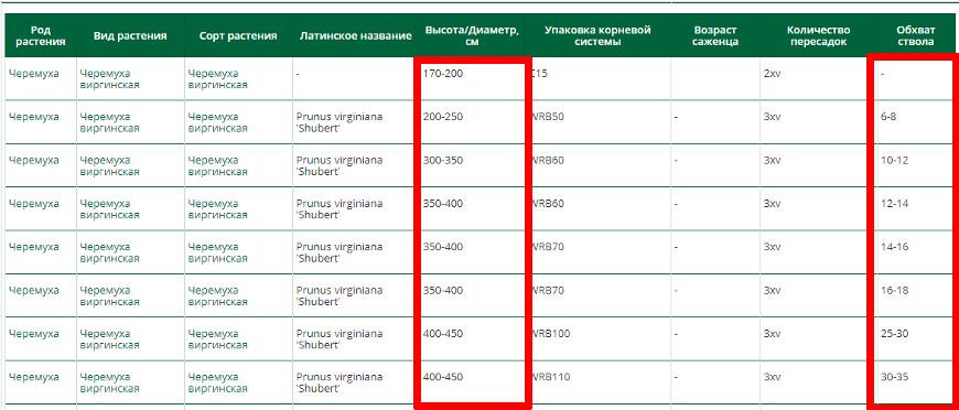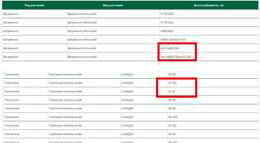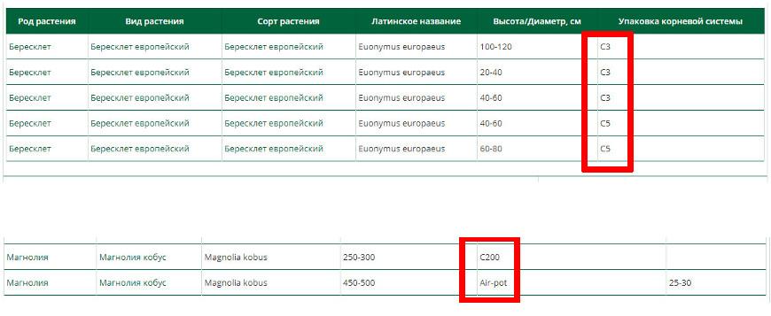 Деревья. Указываются высота растения и/или обхват ствола, все значения приводятся в сантиметрах. Высота (иногда маркируется буквой Н — hight) чаще всего дается не в абсолютном значении, а в некотором диапазоне, например, 50-80 см, 100-125 см и т. д, так как измерить каждый саженец в отдельности не представляется возможным. Обхват ствола также указывается в диапазоне: 8-10 (или 8/10 – через «косую»). В конечном счете характеристики размеров дерева могут выглядеть так: «250 – 300, 8/10», где первое значение – высота, второе – обхват ствола.
