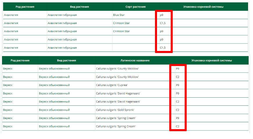 RB/C – растение, пересаженное из грунта в контейнер и не успевшее укорениться.