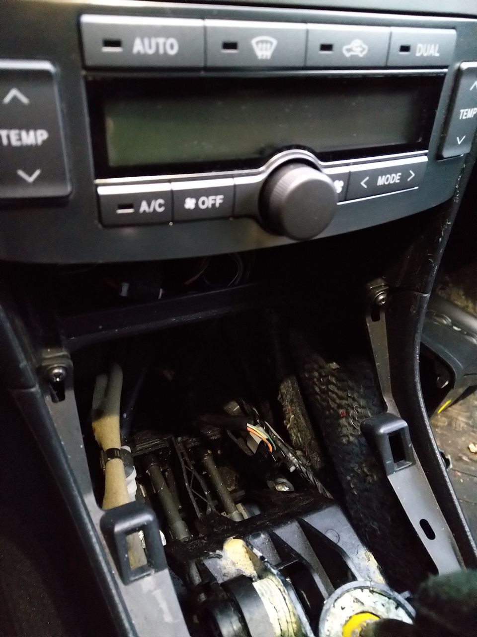 Начинается всё аналогично тому, что уже проделывал при замене головного устройства. Отцепить кожух кулисы, вытащить переднюю панель с пепельницей, при этом не забываем о разъемах проводки. Затем открутить 2 винта на кожухе с кнопками включения «попогрейки» и потянуть его вверх, он крепится на 6 защелках. После открутить 4 винта, крепящие тоннель.