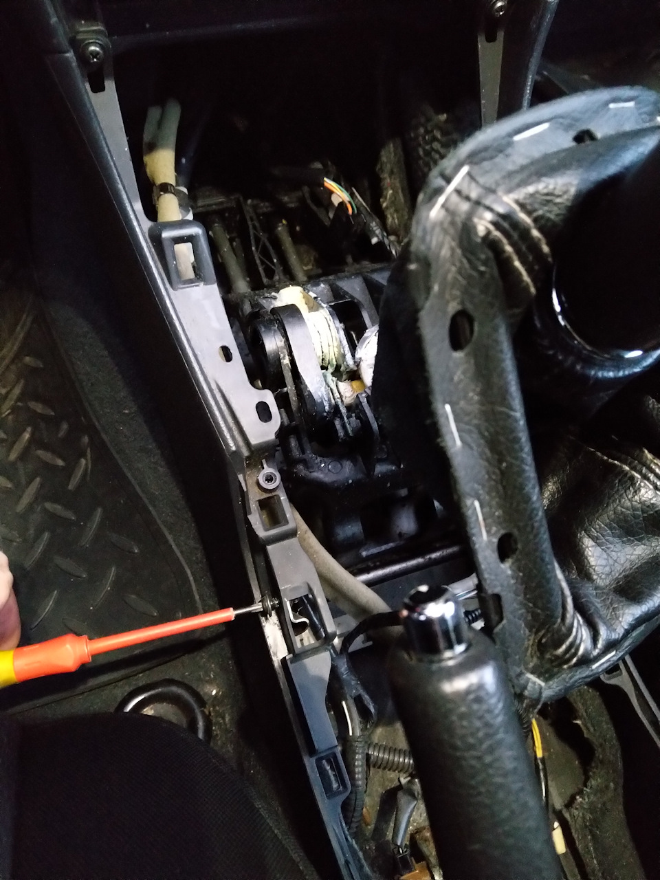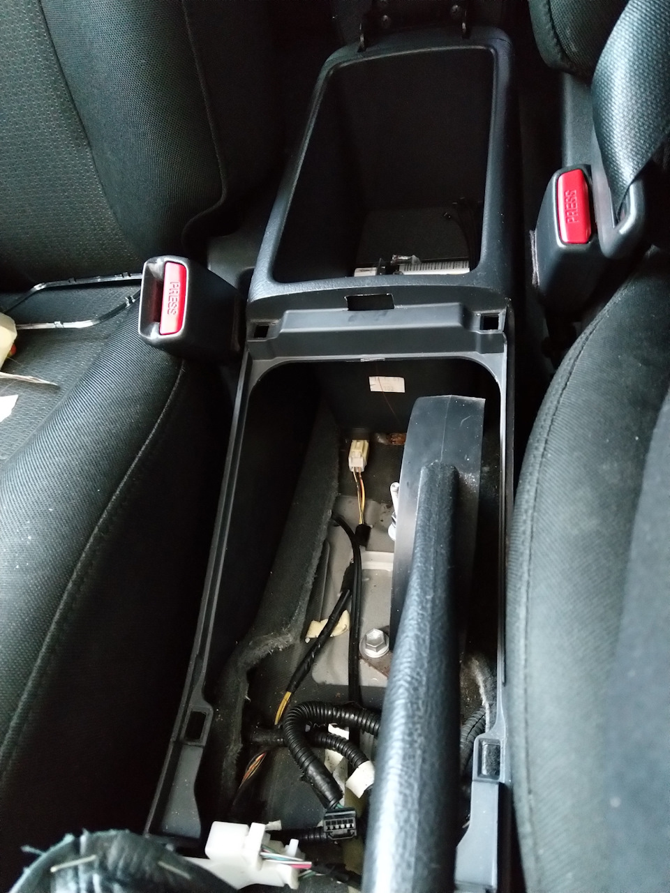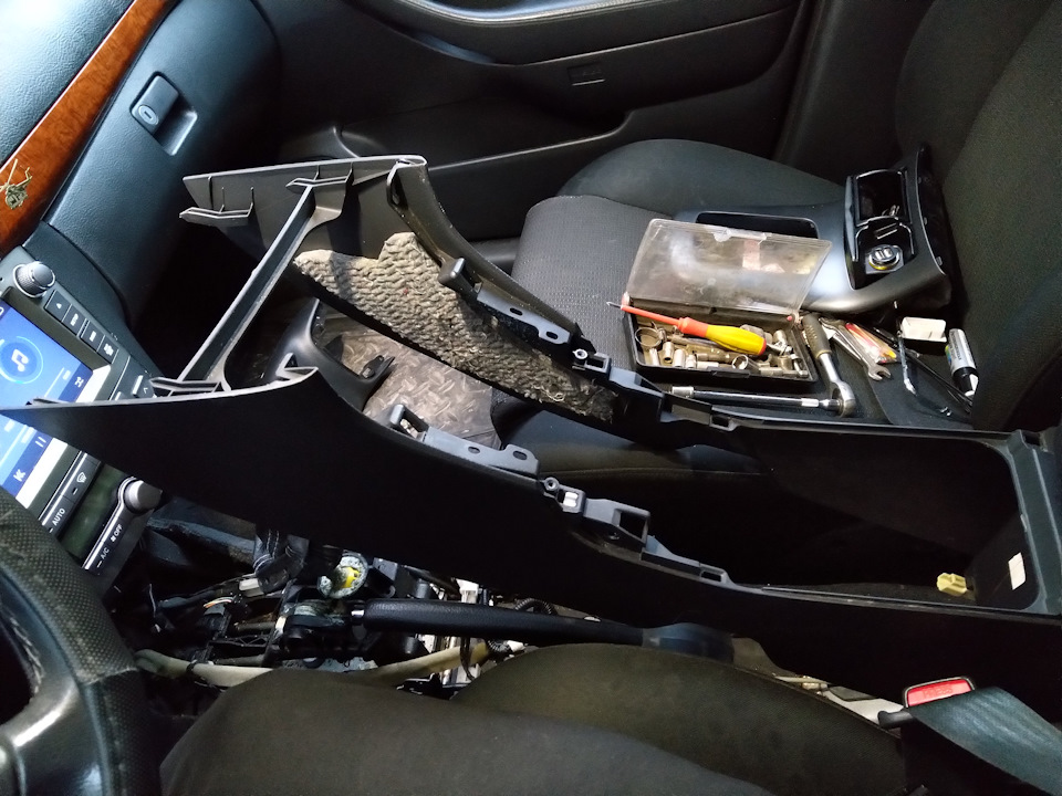 Под ковриком в нижнем контейнере подлокотника, а так же сзади, слева и справа от прикуривателя выкрутить 4 болта под ключ на 10мм