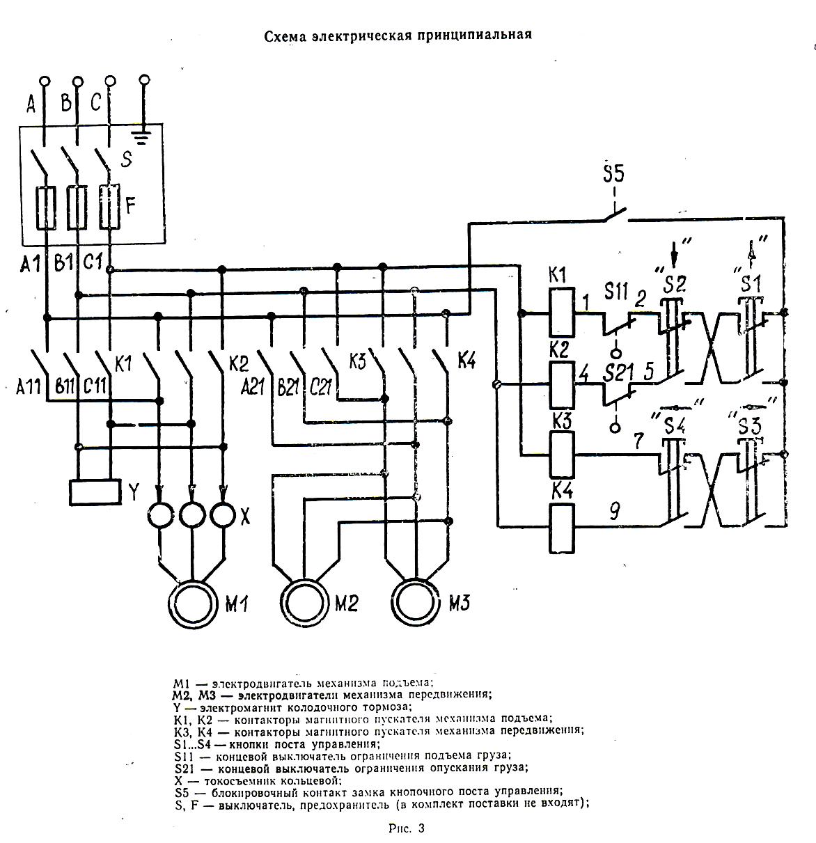 Принципиальная электрическая схема мостового крана и грузоподъемного оборудования любого типа разрабатывается исходя из назначения устройства. Ходовая тележка смонтирована на монорельсе 3 , опирается ходовыми колесами на нижние полки двутавровой балки.