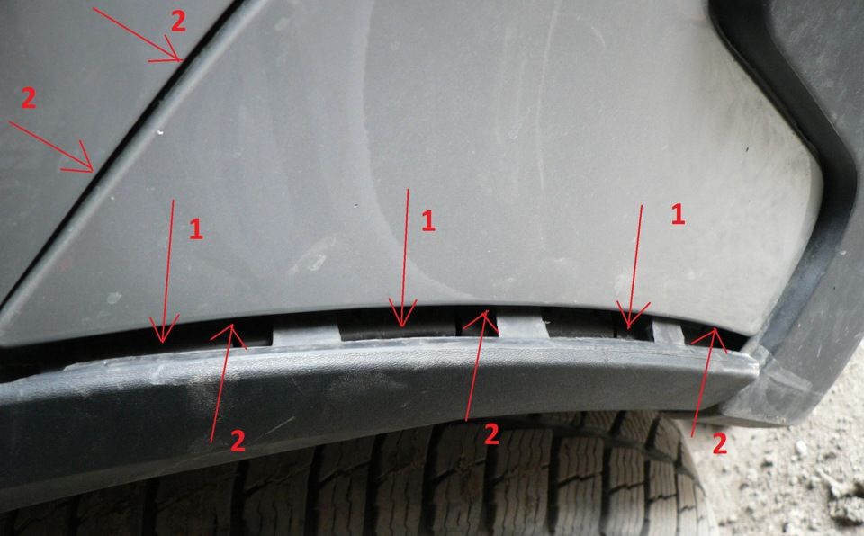 Широкой отверткой на минус (с обмотанной на ней тряпкой) выводим защелки в нижней части бампера (стрелки с цифрой — 1). Всю накладку под аркой — снимать ненужно (пусть так и висит).