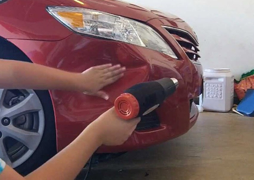 2-й способ устранения мелких вмятин и царапин на пластиковом автобампере — это выпрямление поврежденного участка термофеном. Суть метода — поврежденная поверхность равномерно прогревается строительным феном. За счет термической обработки происходит выравнивание и выпрямление повреждения.